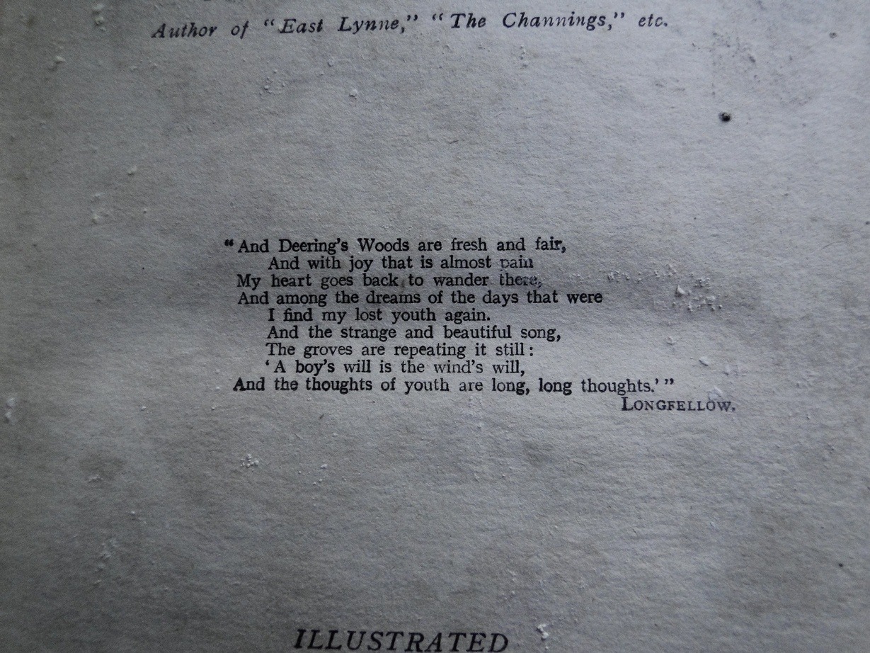One of the few objects left, and the only book, was Roland Yorke (1912), by Mrs Henry Wood; the epigraph on the title page is the last stanza from Henry Wadsworth Longfellow’s poem “My Lost Youth”.