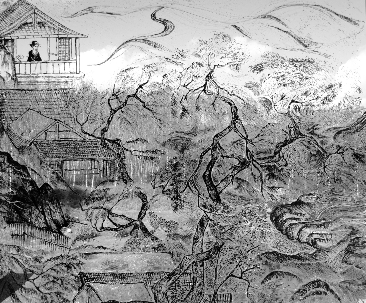 It’s roughly based on this Chinese painted scroll, but I turned it into a snowstorm and replaced the little elderly philosopher with a woman vaguely inspired by this woodblock, …I feel a little uneasy about mixing them but this is my goddamn bathroom window and I don’t want that dude watching me shower. In my head the woman is a scholar-poet composing flattering verse about my fish-belly skin when she’s not busy watching the storm and pondering her strange world of boiling seas and mangled perspective.