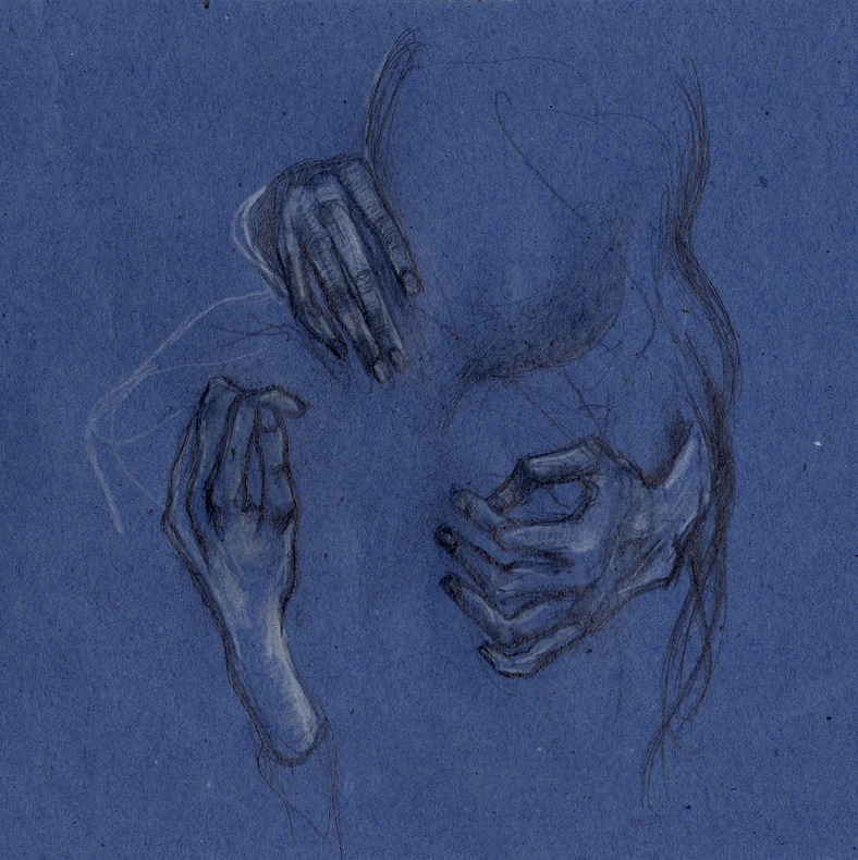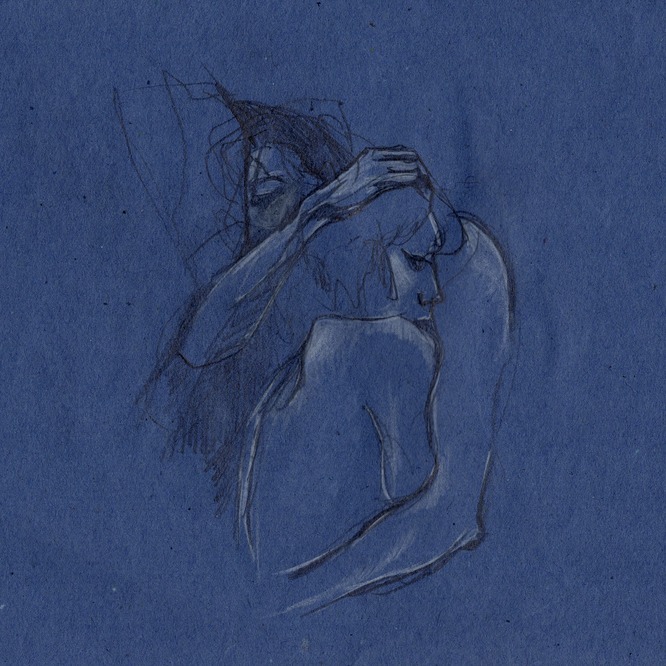 sketches. graphite & white pencil on blue sugar paper. (approx 6×6 inches)