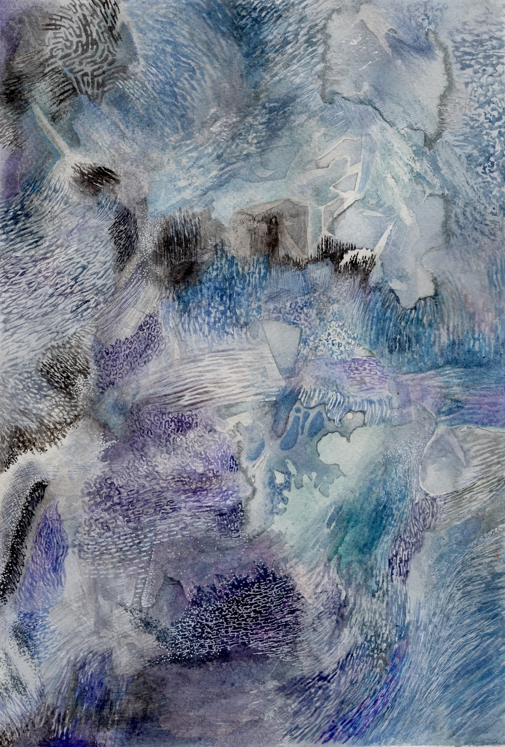Ink, watercolour, graphite, white pen, metallic ink, watersoluble pencil on paper. (7.5×11″)