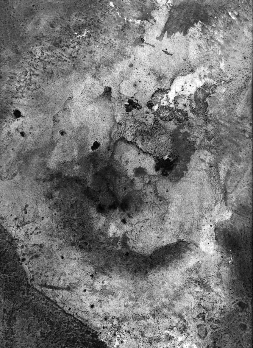 digital manipulation of a collage made from a linocut print and several burnt oil paintings made on photo paper.