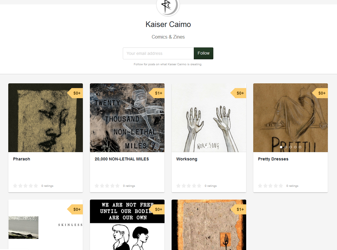 I’ve put a rake of my comics/zines up on Gumroad mostly for free/pay what you want. https://gumroad.com/kaisercaimo