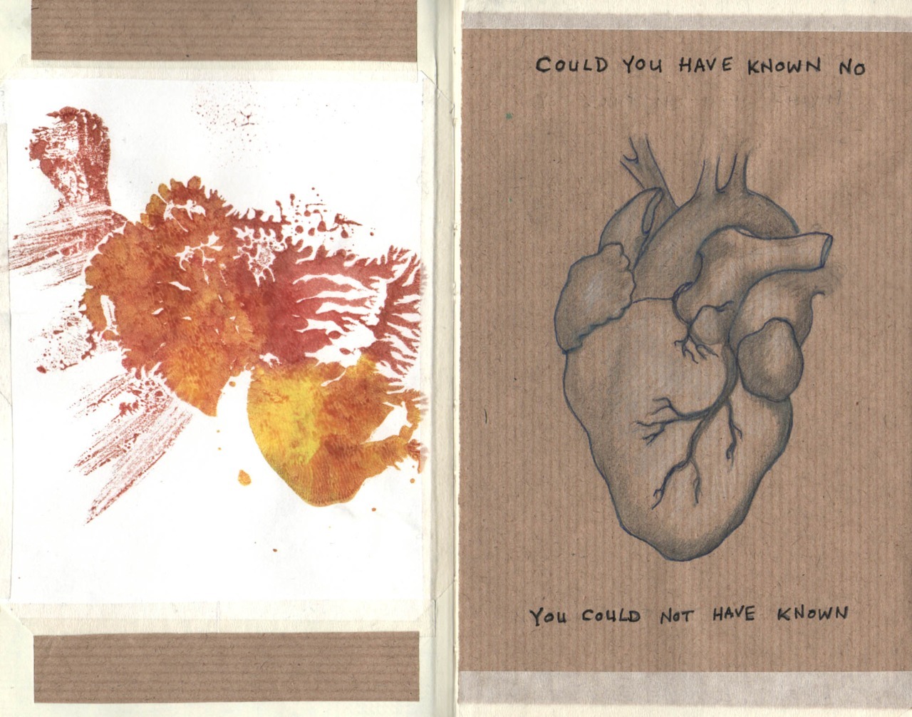 Could You Have Known – page from Moleskine sketchbook. Mixed media. (Collage, monoprint, pencil, ink, watercolour etc.)