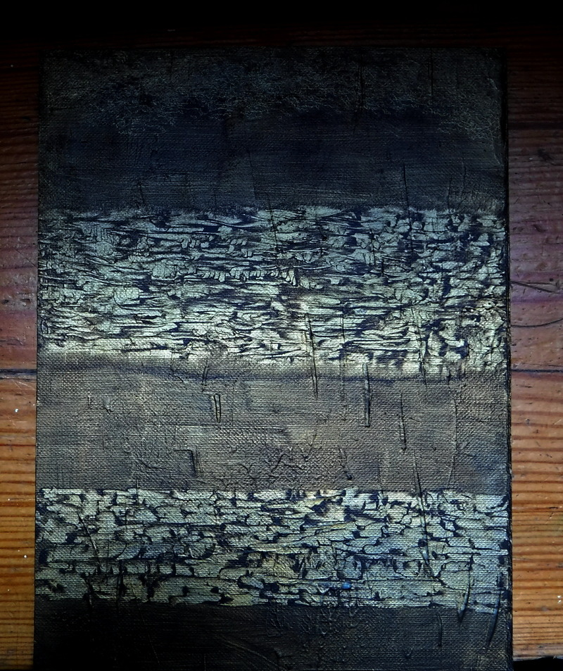 I’ve been reworking some old abstract paintings where I’d messed around with gesso and impasto acrylic trying to generate texture using knives, clingfilm, anything that came to hand. A layer of gold metallic acrylic paint acts like trapped light so that later layers of darker oil paint are infused with warmth. These upper layers of burnt umber and sienna tones can be scraped back to reveal a kind of internal glow, like heat trapped in the earth.