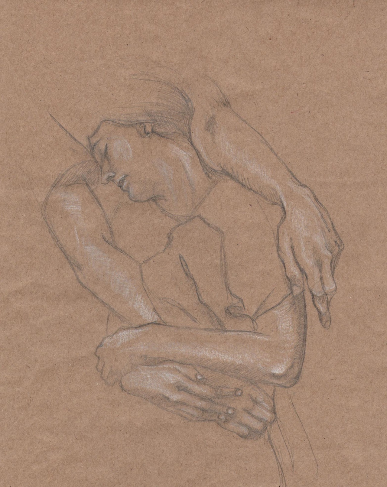Head study. Graphite and white pencil (Staedtler Glasochrom) on brown paper.