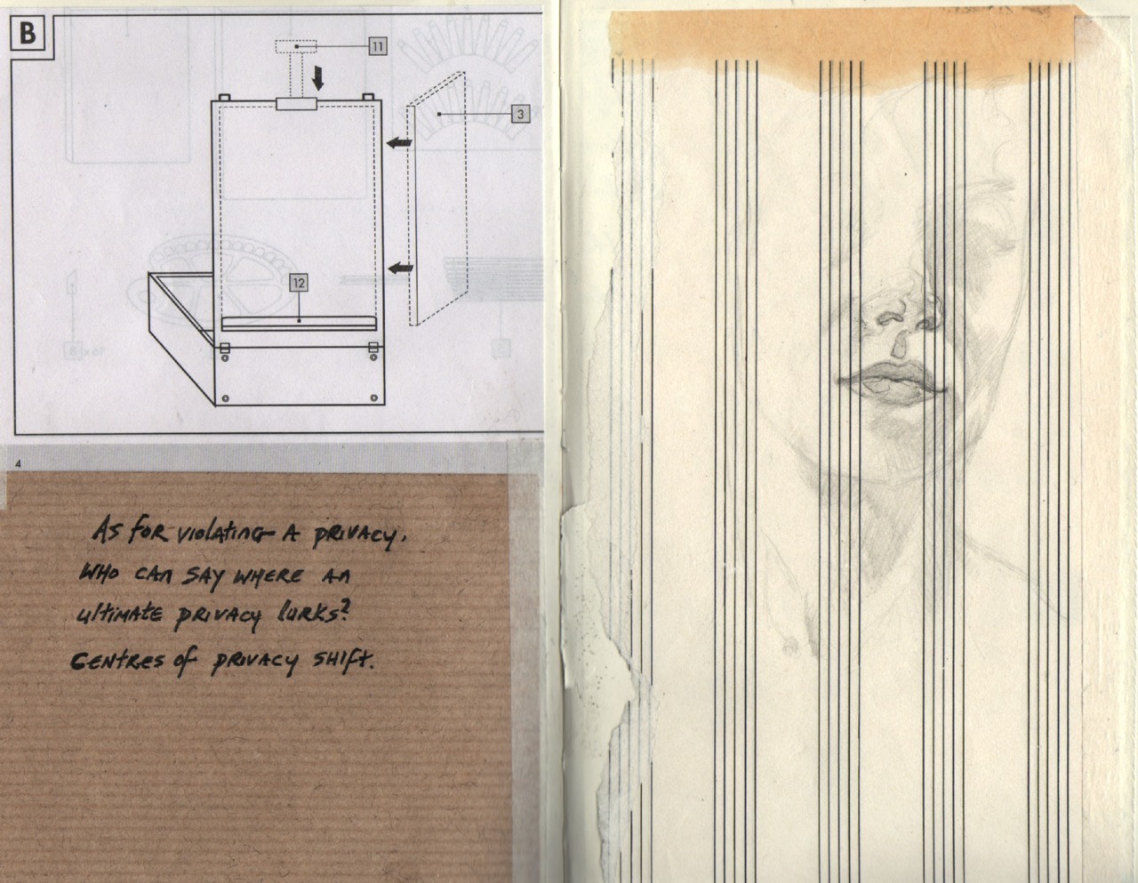 As For Violating a Privacy… – page from Moleskine sketchbook. Pencil, collage, etc.