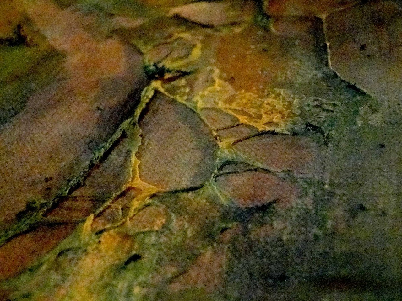 I took it home, cleaned it down with turpentine and added a fresh coat of gesso, deliberately thin and patchy so as not to drown the textures. I even primed the back, to cover a few fraying weaknesses in the canvas and stifle an incipient mould colony.