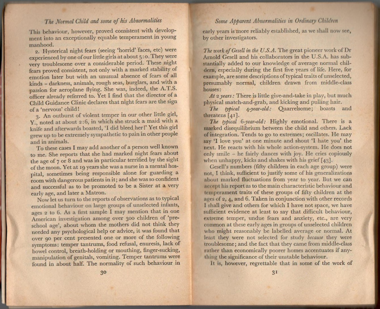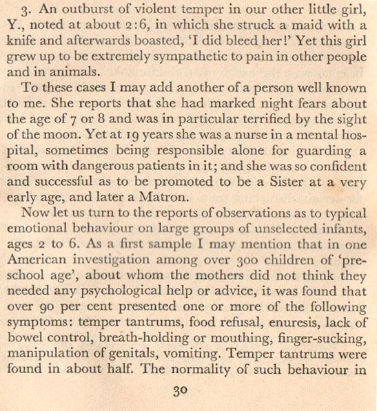 …I may mention that in one American investigation among over 300 children of ‘pre-school age’, about whom the mothers did not think they needed any psychological help or advice, it was found that over 90 per cent presented one or more of the following symptoms: temper tantrums, food refusal, enuresis, lack of bowel control, breath-holding or mouthing, finger-sucking, manipulation of genitals, vomiting. Temper tantrums were found in about half. The normality of such behaviour…