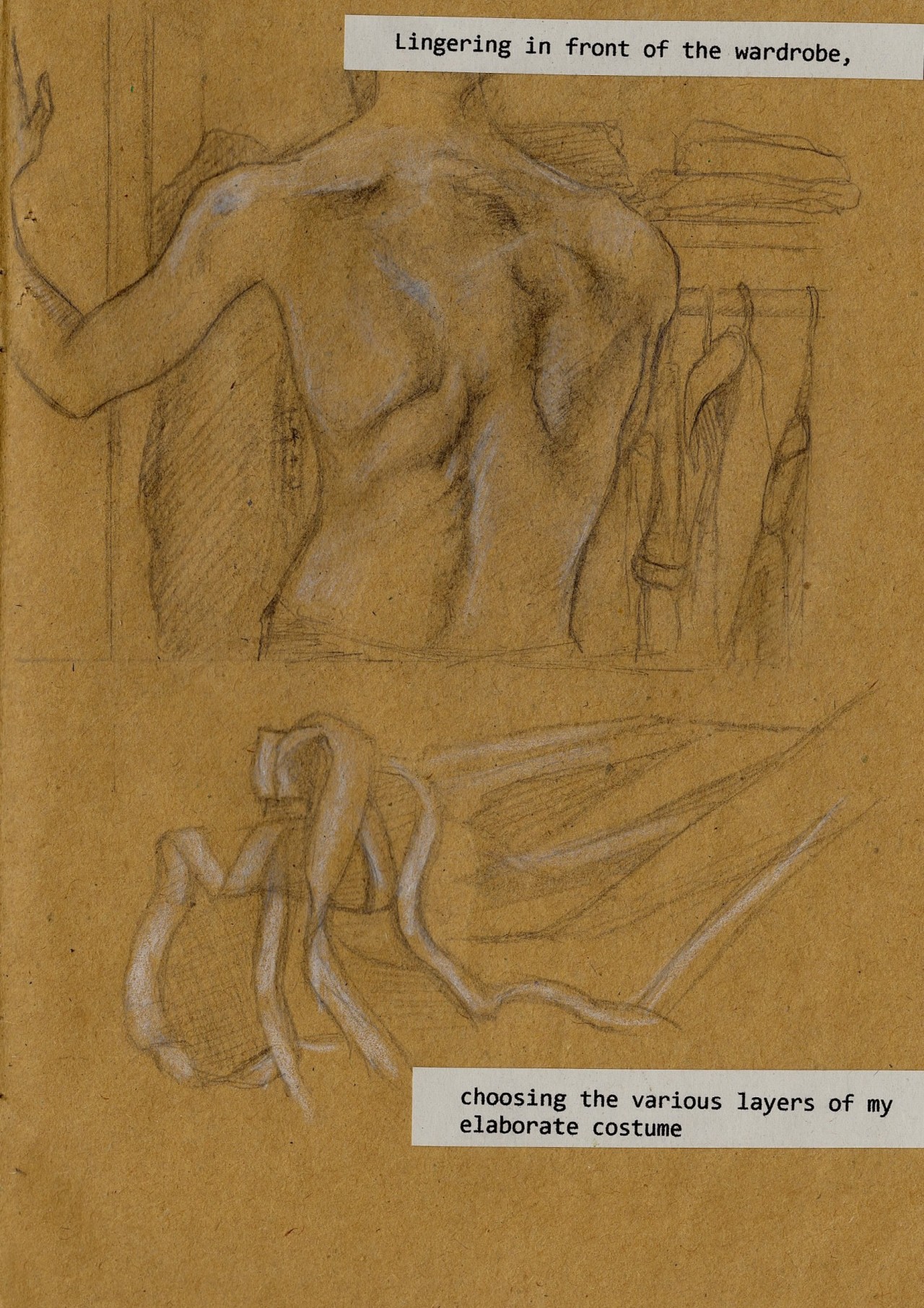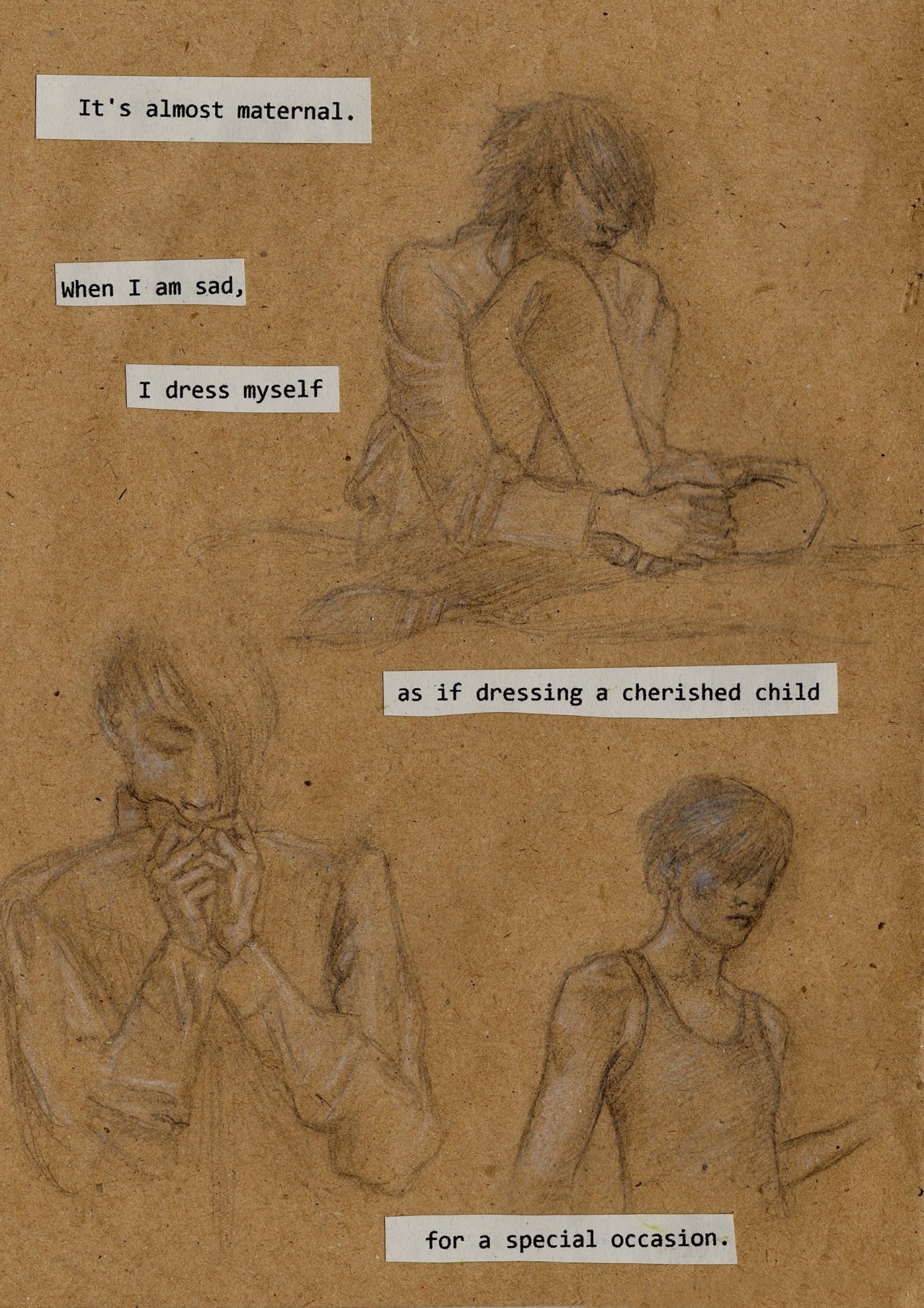 Experimenting with style/ideas for another comic/book thing. Quick and sloppy ink and pencil drawings on brown paper, photocopied and reworked with pen.